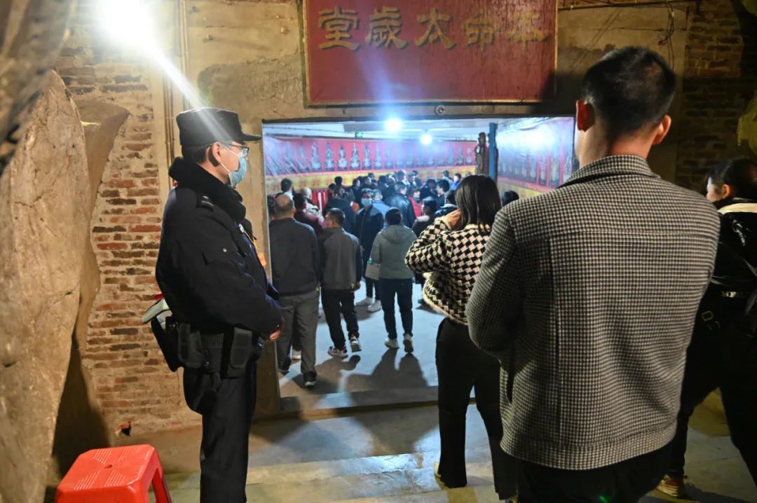 ▲2月26日晚,市公安局黨委委員、政治部主任熊啟堯,柳城縣委常委、政法委書記金耀,市公安局治安支隊支隊長蔡天來等領(lǐng)導(dǎo)親臨廟會活動現(xiàn)場指導(dǎo)。