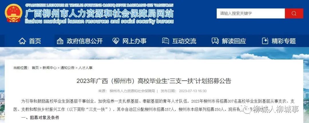 7月13日,市人力資源和社會(huì)保障局發(fā)布《2023年廣西(柳州市)高校畢業(yè)生“三支一扶”計(jì)劃招募公告》,我市將招募307名高校畢業(yè)生到基層從事支農(nóng)、支醫(yī)、支教和幫扶鄉(xiāng)村振興工作(以下簡(jiǎn)稱“三支一扶”)。其中,柳城縣計(jì)劃招募35人。14日起,報(bào)考人員可通過網(wǎng)上報(bào)名和筆試確認(rèn)。