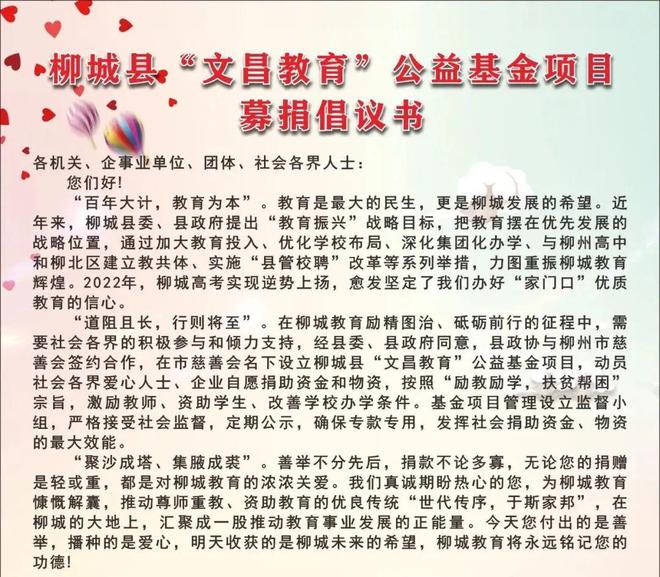 一年來,基金會(huì)開展了形式多樣的捐資助學(xué)活動(dòng),率先發(fā)出1200余份宣傳單,在縣教育局和全縣各所學(xué)校開展宣傳募捐,還得到了21個(gè)在柳城投資和在外創(chuàng)業(yè)柳城籍的愛心企業(yè)以及40位愛心人士的大力支持。