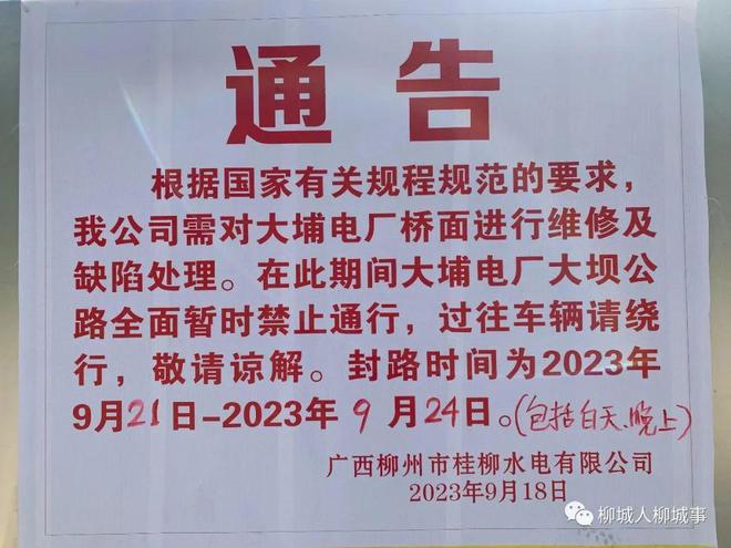 根據(jù)國家有關(guān)規(guī)程規(guī)范的要求,我公司需對大埔電廠橋面進(jìn)行維修及缺陷處理。在此期間大埔電廠大壩公路全面暫時禁止通行,過往車輛請繞行,敬請諒解。封路時間為2023年9月21日-2023年 9月24日。(包括白天晚上)