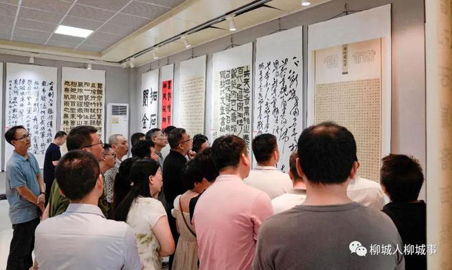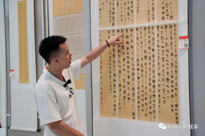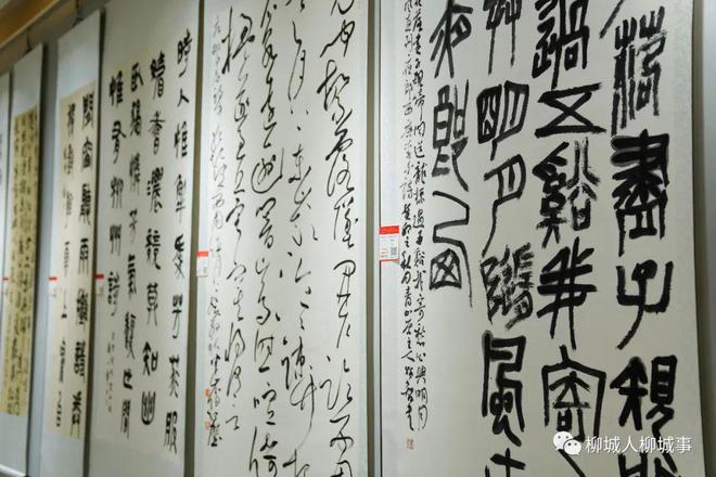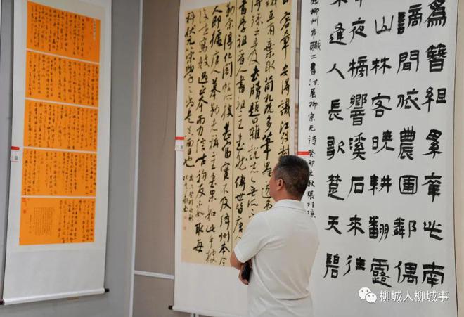 在柳城縣總工會(huì)一樓展廳,來自柳州市各縣區(qū)參賽者的100幅作品一一懸掛在展示墻或展示架上,行書、草書、隸書等各類型字體書法作品各展風(fēng)采,吸引眾多書法愛好者們紛紛駐足欣賞。