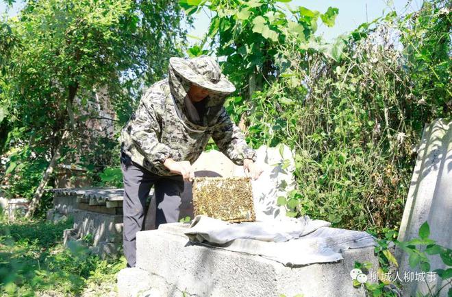 小編在村民覃莫英家門口左側(cè)的空地上看到,一個(gè)接連一個(gè)的蜂箱,錯(cuò)落有致的擺放在用水泥磚砌好的房子里。蜜蜂發(fā)出“嗡嗡”的聲音,成群結(jié)隊(duì)的在蜂箱進(jìn)進(jìn)出出。覃莫英在蜂箱之間來回穿梭,小心翼翼地取出一塊塊飽含蜂蜜的蜂巢進(jìn)行觀察。這段時(shí)間,他要趁著天氣暖和,搖出新鮮的蜂蜜。
