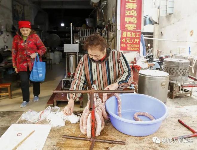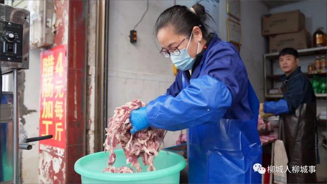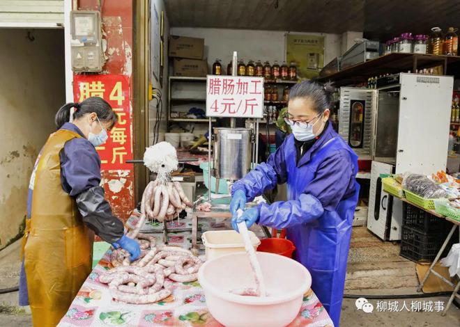 在大埔鎮(zhèn)農(nóng)貿(mào)市場,多家店鋪擺出“臘腸加工”的字樣。在小飛食雜店門口,小編看到,早早就有市民拿著新鮮豬肉前來加工臘腸,店員們有序地進行臘腸加工程序,碎肉、拌料、灌腸、扎繩……