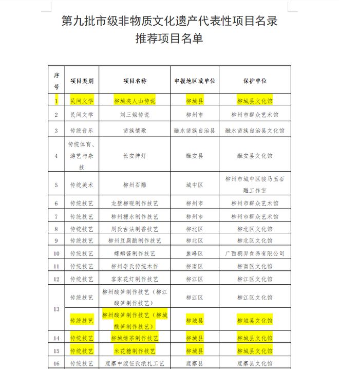 根據(jù)《中華人民共和國非物質(zhì)文化遺產(chǎn)法》、《廣西壯族自治區(qū)非物質(zhì)文化遺產(chǎn)保護條例》精神,2023年10月,柳州市文化廣電和旅游局組織有關(guān)專家按照評審標(biāo)準(zhǔn)對各縣區(qū)申報的非遺項目進行了評審,評選出第九批市級非物質(zhì)文化遺產(chǎn)代表性項目名錄推薦項目名單35項。