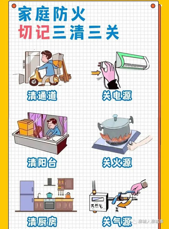 一、居家記得“三清三關(guān)”。“三清”易燃可燃物,即:清廚房、清陽(yáng)臺(tái)、清樓道;“三關(guān)”危險(xiǎn)源,即:使用結(jié)束或出門前關(guān)燃?xì)?、關(guān)電源、關(guān)火源。