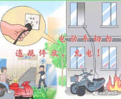 五、電動(dòng)車嚴(yán)禁違規(guī)停放或充電。電動(dòng)車一旦起火將迅速釋放出大量有毒煙氣,嚴(yán)禁將電動(dòng)車在家中及樓道停放或充電。