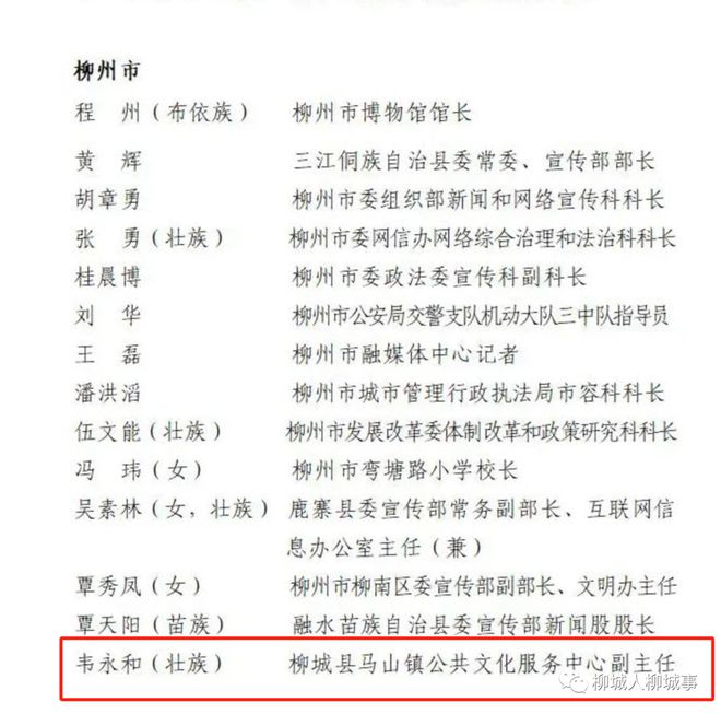 12月25日,自治區(qū)黨委宣傳部發(fā)布廣西宣傳思想文化工作先進集體和先進個人擬表彰名單公示。柳城縣馬山鎮(zhèn)公共文化服務(wù)中心副主任韋永和入圍廣西宣傳思想文化工作先進個人。