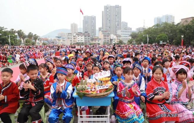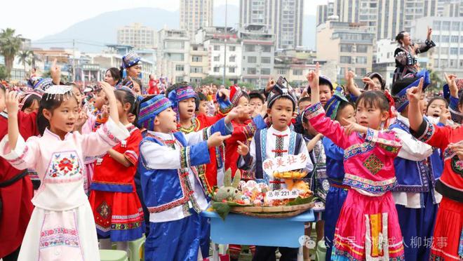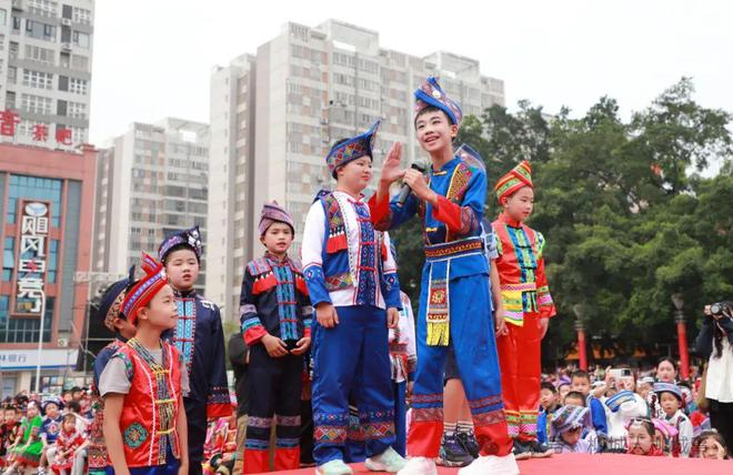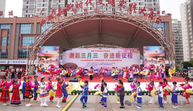 4月9日,鑄牢中華民族共同體意識(shí)——“潮起三月三 奮進(jìn)新征程”2024年柳城縣中小學(xué)校各族青少年交流主題實(shí)踐活動(dòng),在縣城白陽廣場舉行。來自柳城縣實(shí)驗(yàn)小學(xué)教育集團(tuán)的師生身著少數(shù)民族服飾,唱著山歌跳著舞,共同慶祝“廣西三月三”。