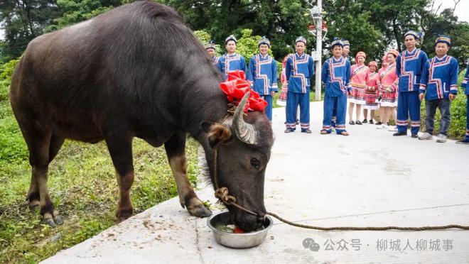 活動(dòng)開始,伴隨著“咚咚鏘!咚咚鏘!”的鑼鼓聲,村民紛紛身著仫佬族傳統(tǒng)服飾獻(xiàn)舞,祈求來年風(fēng)調(diào)雨順,五谷豐登。村民給“牛欄神”獻(xiàn)素菜,唱起牛歌,歌頌耕牛的辛苦和功勞,又將當(dāng)天新鮮出鍋的五色米飯拿給耕牛享用,讓耕??梢韵硎艿阶约盒量喔N的成果。
