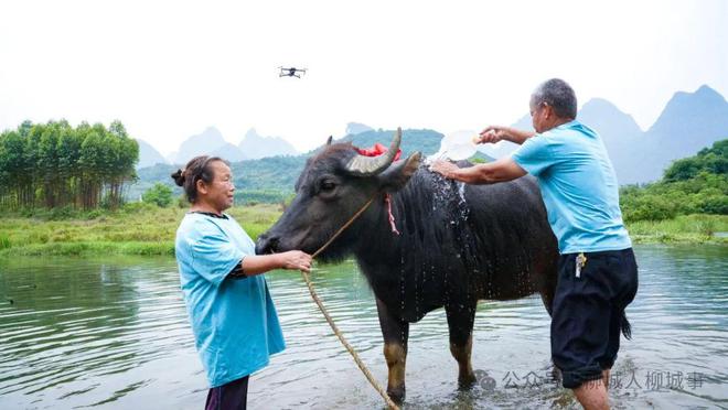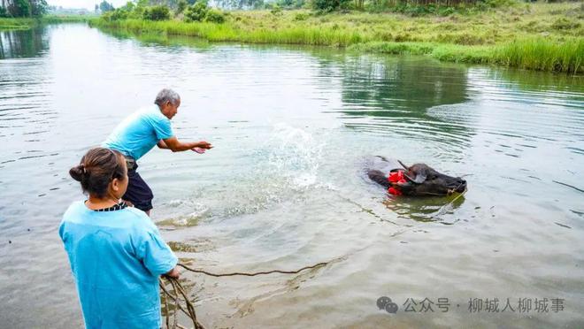 村民把牛牽到河邊,將牛一身污泥洗凈,讓牛享受著這難得的清閑一刻。