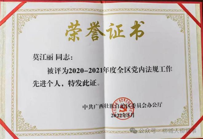 2017、2018、2019連續(xù)三年年度考核優(yōu)秀,榮立三等功,2022年被評為2020—2021年度全區(qū)黨內(nèi)法規(guī)工作先進個人,2024年獲柳城縣第十二屆道德模范敬業(yè)奉獻模范榮譽稱號……她就是——莫江麗。 提起莫江麗,就不得不提一提她的工作。