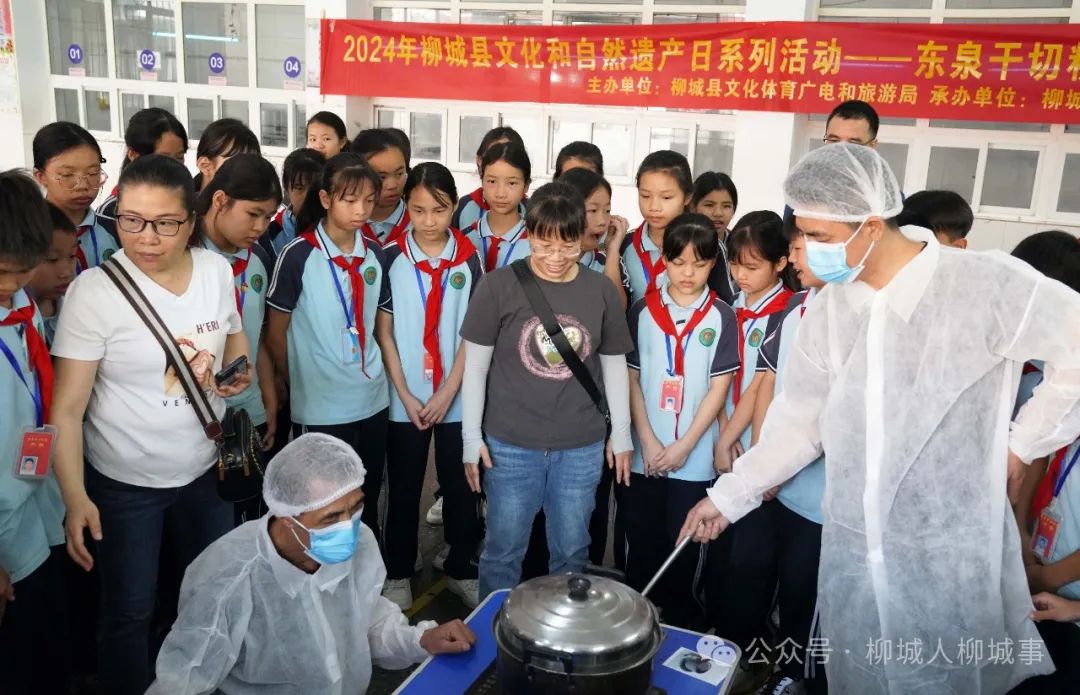 本次活動還邀請到了柳城干切粉制作技藝傳承人現(xiàn)場展示干切粉的制作過程,并向?qū)W生介紹選米、浸泡、蒸煮等制作環(huán)節(jié),鼓勵孩子們動手參與。