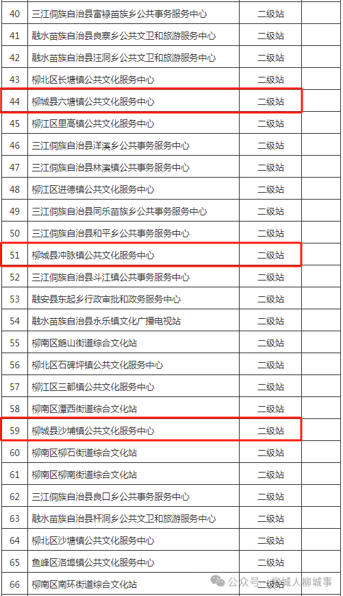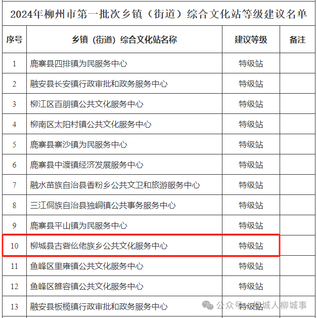 近日,柳州市文化廣電和旅游局組織開展對全市各縣區(qū)2024年第一批次鄉(xiāng)鎮(zhèn)(街道)綜合文化站評估定級工作,擬推薦鄉(xiāng)鎮(zhèn)(街道)綜合文化站特級站13個、一級站26個、二級站27個、三級站6個報自治區(qū)文化和旅游廳審核、復(fù)查。其中,柳城縣有9個公共文化服務(wù)中心上榜。
