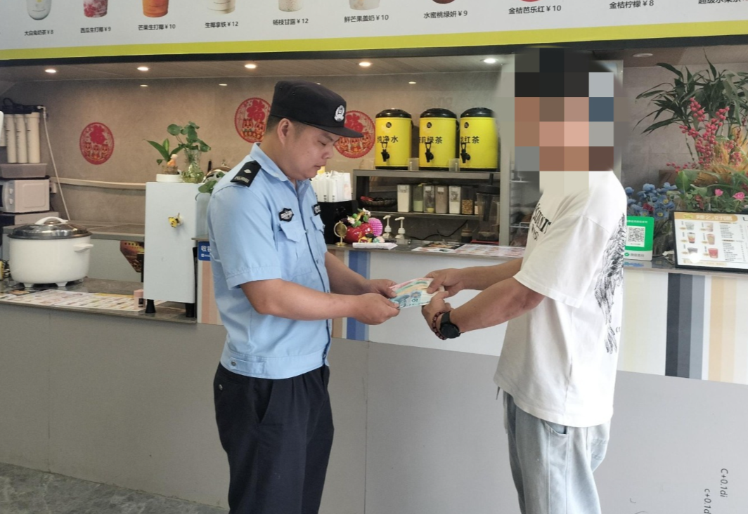 5月15日,龍頭派出所民輔警在進行日常的走訪入戶任務(wù)時,在一奶茶店的空桌子發(fā)現(xiàn)有散落的現(xiàn)金,于是立即上前撿拾。經(jīng)現(xiàn)場清點,散落的現(xiàn)金合計有350元。經(jīng)查看監(jiān)控視頻后,輔警發(fā)現(xiàn)原來是店鋪老板從衣服口袋里拿手機時不慎掉落的現(xiàn)金。輔警將現(xiàn)金當(dāng)面清點無誤便歸還給了店鋪老板。