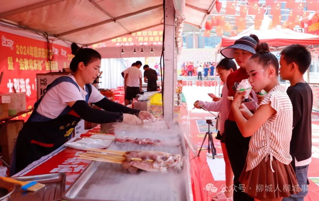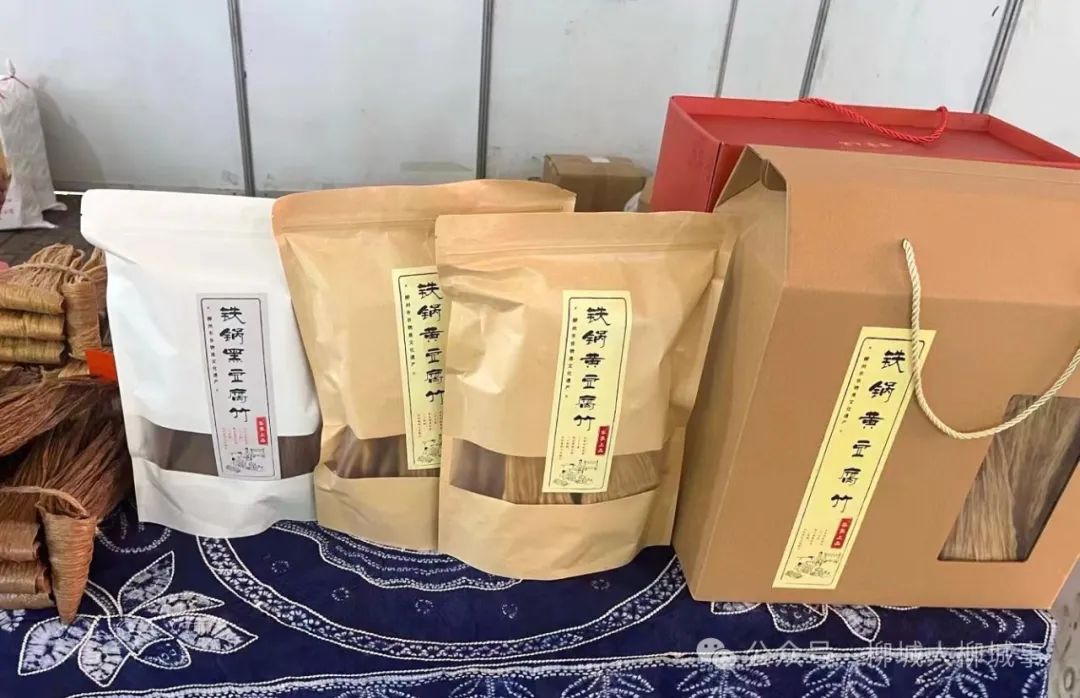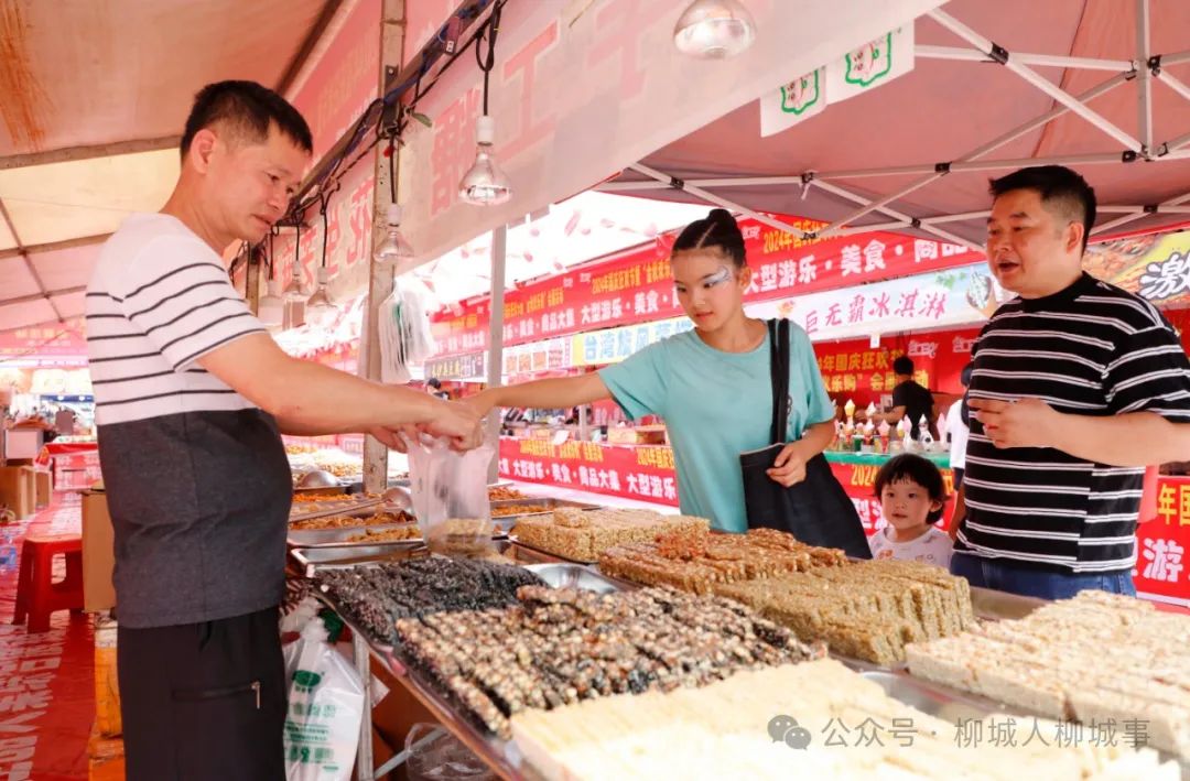 舞臺周圍設置了展位,除了柳城非遺腐竹、干切粉、牛臘巴等本土農(nóng)特產(chǎn)品外,還有其他美食小吃、家用器具、家居服裝等商品,攤位前的人流也絡繹不絕。大家邊走邊看邊嘗,挑選心儀物品,享受逛街購物的快樂。