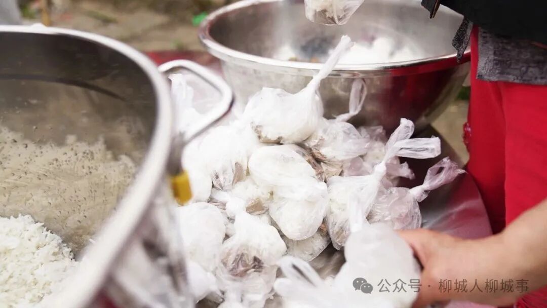 在分發(fā)社飯時,幾個村民正將熱氣騰騰的米飯舀入袋中,再將一片豬肝包入飯里。這一獨特的習俗寓意著“平平安安”,寄托了對來年生活順遂的美好祝福。正在包社飯的唐阿姨告訴我們,她前幾天特地從南寧回來?!拔以谕饷娲蚱戳?7年,每年都堅持回來過春社,因為始終舍棄不掉的,是這一抹鄉(xiāng)愁。”