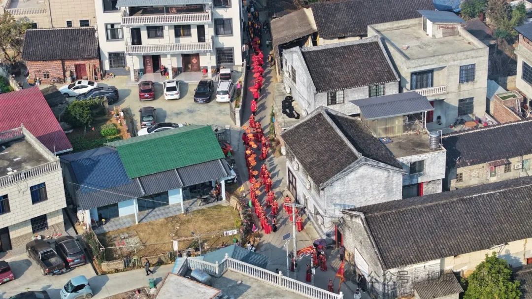 當天上午,外嫁“金花”們身著大紅禮服,撐著花傘,挑著花籃,在舞獅隊的帶領(lǐng)下,從東泉鎮(zhèn)新時代文明實踐廣場走回村中。村中的鄉(xiāng)親們,搭起拱門,放起鞭炮,迎接他們的“女兒”回家。
