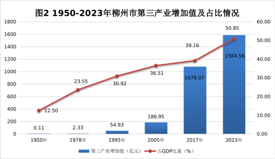 表1 1950年—2023年柳州市三次產(chǎn)業(yè)增加值結(jié)構(gòu)表(%)