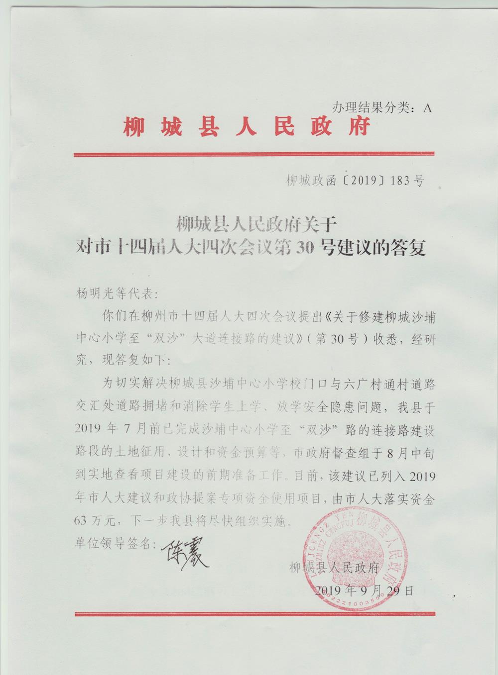 你們在柳州市十四屆人大四次會議提出《關(guān)于修建柳城沙埔中心小學(xué)至“雙沙”大道連接路的建議》(第30號)收悉,經(jīng)研究,現(xiàn)答復(fù)如下: