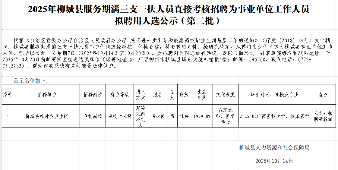 2025年柳城縣服務(wù)期滿三支一扶人員直接考核招聘為事業(yè)單位工作人員擬聘用人選公示(第二批)