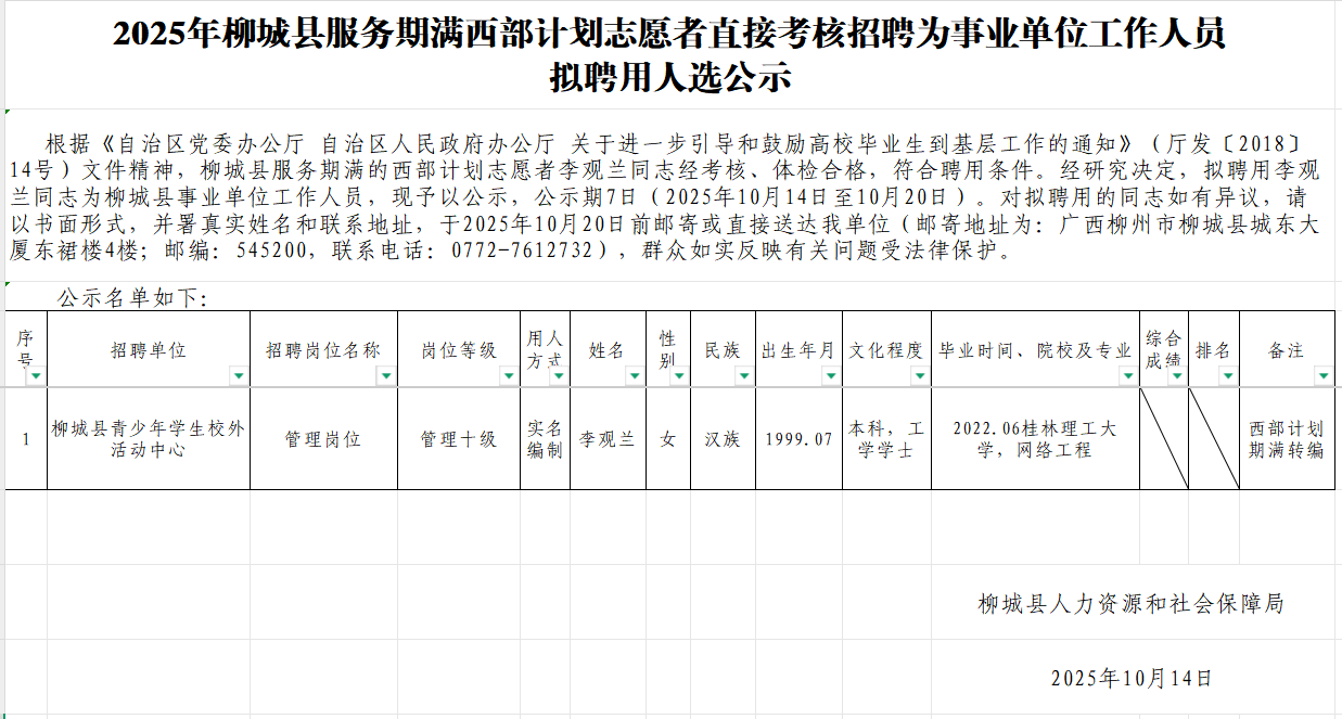 2025年柳城縣服務(wù)期滿西部計(jì)劃志愿者直接考核招聘為事業(yè)單位工作人員擬聘用人選公示