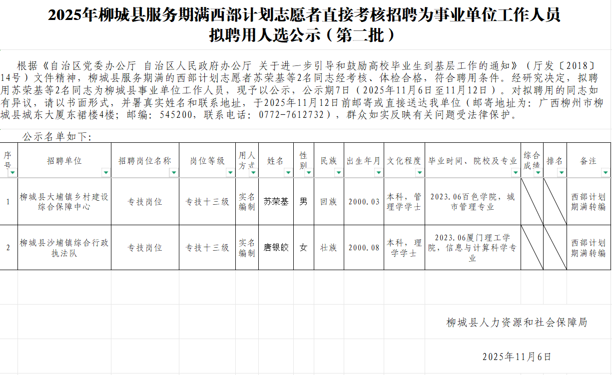 2025年柳城縣服務(wù)期滿西部計(jì)劃志愿者直接考核招聘為事業(yè)單位工作人員擬聘人員公示 (第二批)
