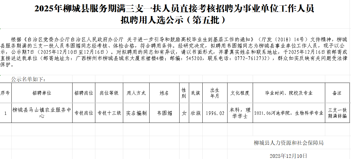 2025年柳城縣服務(wù)期滿三支一扶人員直接考核招聘為事業(yè)單位工作人員擬聘用人選公示(第五批)