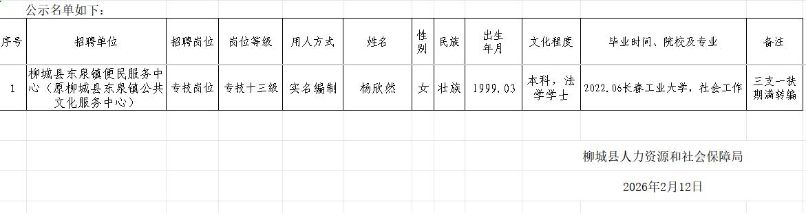 根據(jù)《自治區(qū)黨委辦公廳自治區(qū)人民政府辦公廳 關(guān)于進(jìn)一步引導(dǎo)和鼓勵(lì)高校畢業(yè)生到基層工作的通知》(廳發(fā)〔2018〕14號(hào))文件精神,柳城縣服務(wù)期滿的三支一扶人員楊欣然同志經(jīng)考核、體檢合格,符合聘用條件。經(jīng)研究決定,擬聘用楊欣然同志為柳城縣事業(yè)單位工作人員,現(xiàn)予以公示,公示期7日(2026年2月12日至2月18日)。對(duì)擬聘用的同志如有異議,請(qǐng)以書面形式,并署真實(shí)姓名和聯(lián)系地址,于2026年2月18日前郵寄或直接送達(dá)我單位(郵寄地址為:廣西柳州市柳城縣城東大廈東裙樓4樓;郵編:545200,聯(lián)系電話:0772-7612732),群眾如實(shí)反映有關(guān)問題受法律保護(hù)。