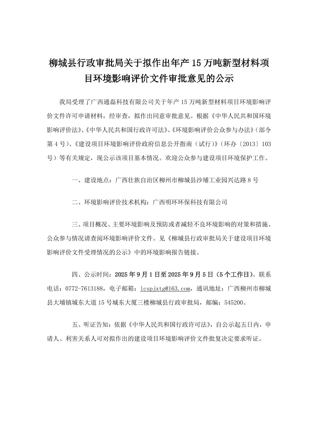柳城縣行政審批局關(guān)于擬作出年產(chǎn)15萬(wàn)噸新型材料項(xiàng)目環(huán)境影響評(píng)價(jià)文件審批意見的公示