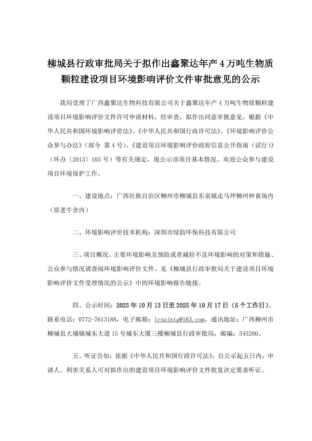 柳城縣行政審批局關(guān)于擬作出鑫聚達(dá)年產(chǎn)4萬(wàn)噸生物質(zhì)顆粒建設(shè)項(xiàng)目環(huán)境影響評(píng)價(jià)文件審批意見的公示