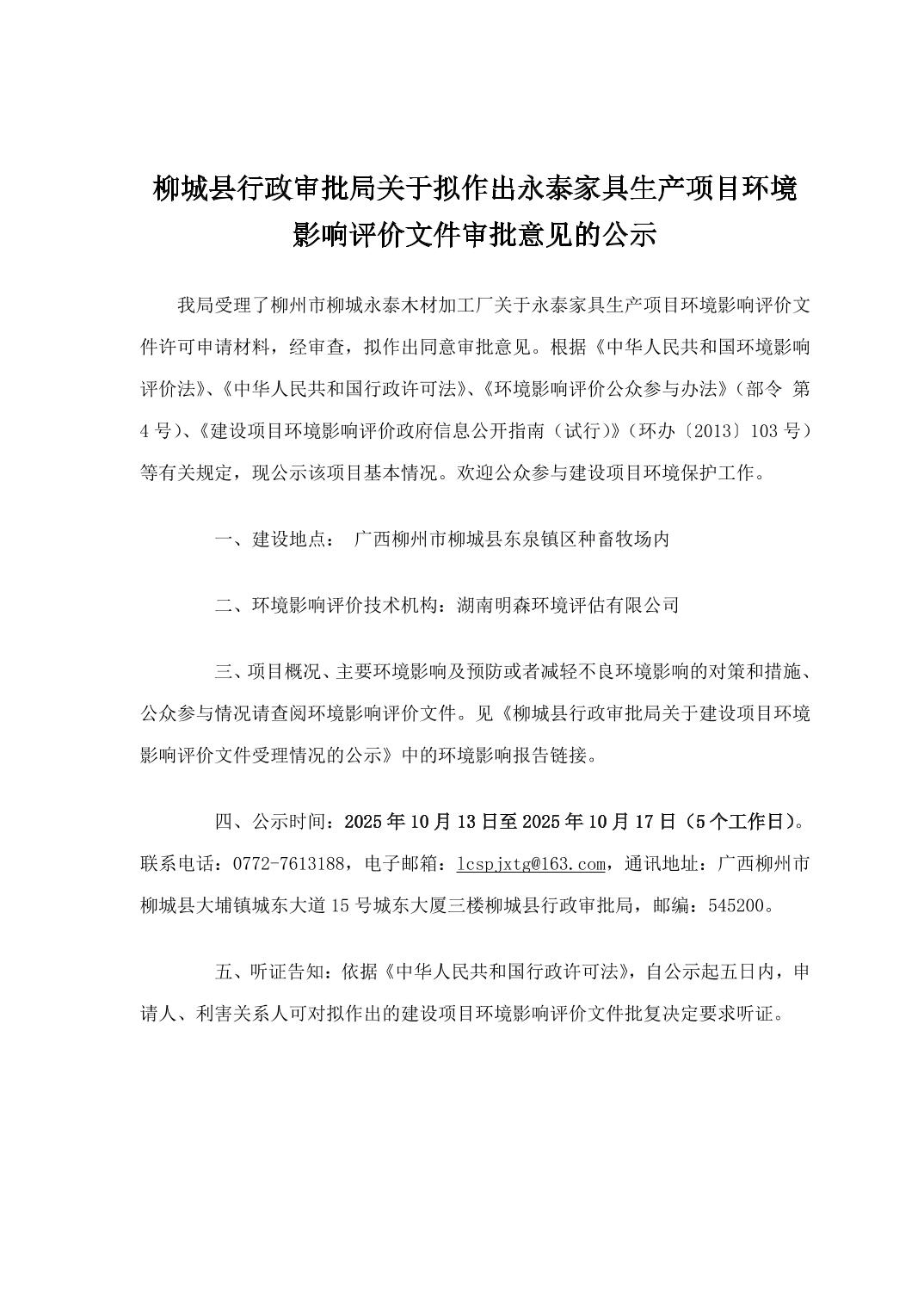 柳城縣行政審批局關(guān)于擬作出永泰家具生產(chǎn)項(xiàng)目環(huán)境影響評(píng)價(jià)文件審批意見(jiàn)的公示