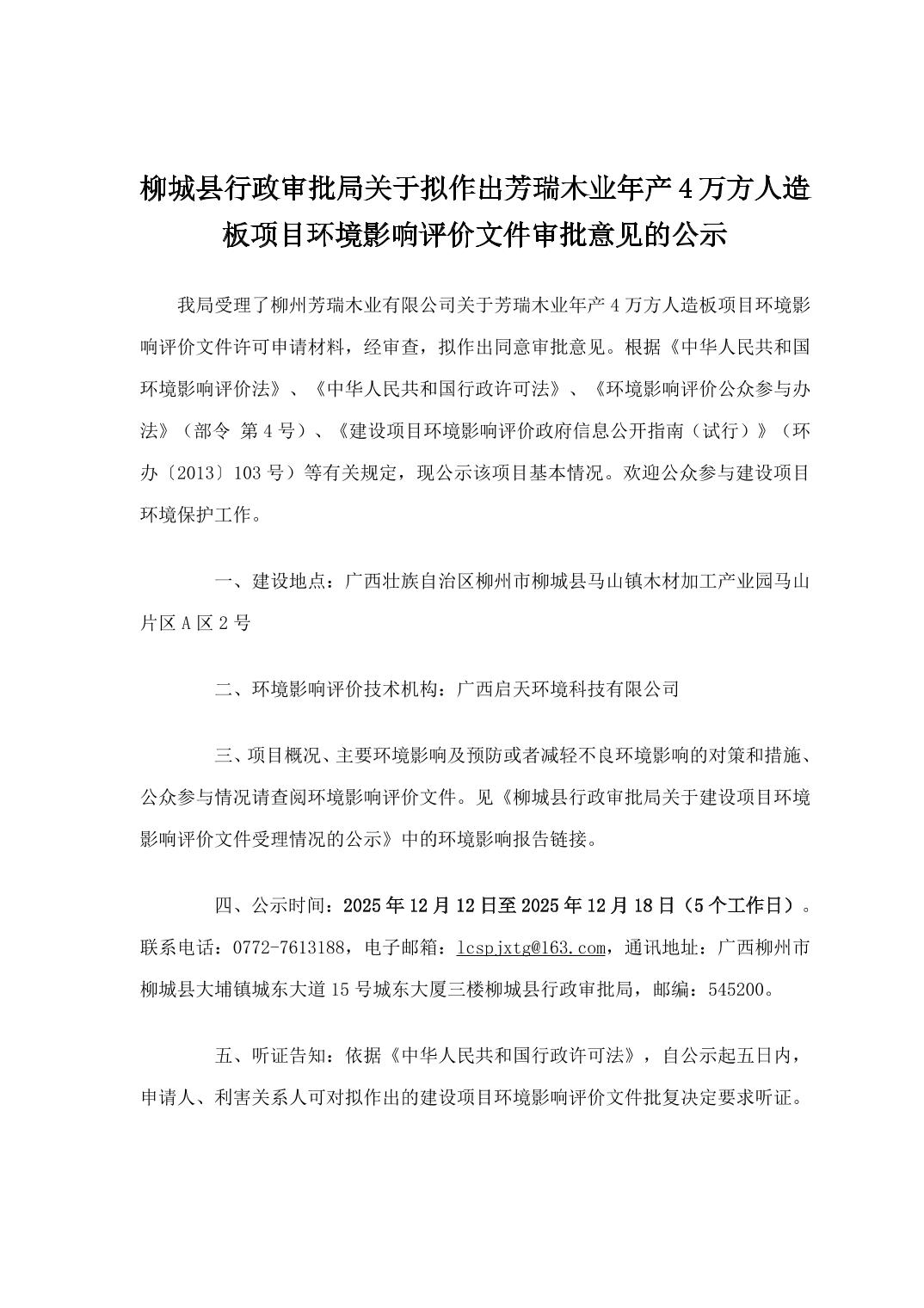 柳城縣行政審批局關(guān)于擬作出芳瑞木業(yè)年產(chǎn)4萬(wàn)方人造板項(xiàng)目環(huán)境影響評(píng)價(jià)文件審批意見(jiàn)的公示