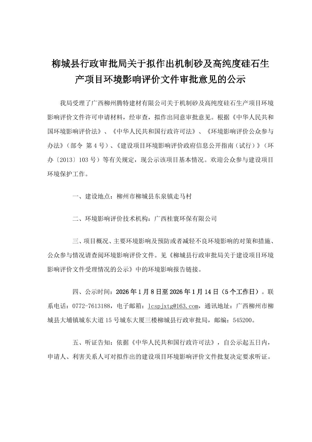 柳城縣行政審批局關于擬作出機制砂及高純度硅石生產(chǎn)項目環(huán)境影響評價文件審批意見的公示