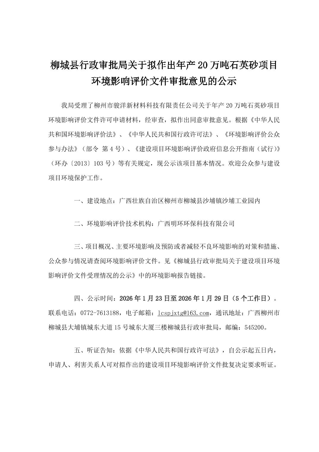 柳城縣行政審批局關(guān)于擬作出年產(chǎn)20萬(wàn)噸石英砂項(xiàng)目環(huán)境影響評(píng)價(jià)文件審批意見(jiàn)的公示