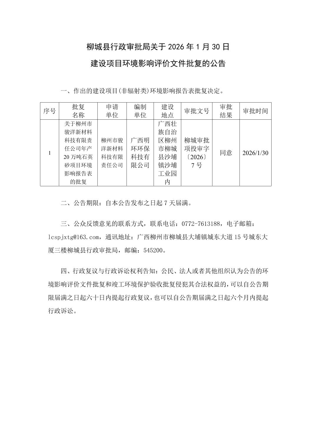 〔2026〕7號-關(guān)于柳州市駿洋新材料科技有限責任公司年產(chǎn)20萬噸石英砂項目環(huán)境影響報告表的批復(fù).docx