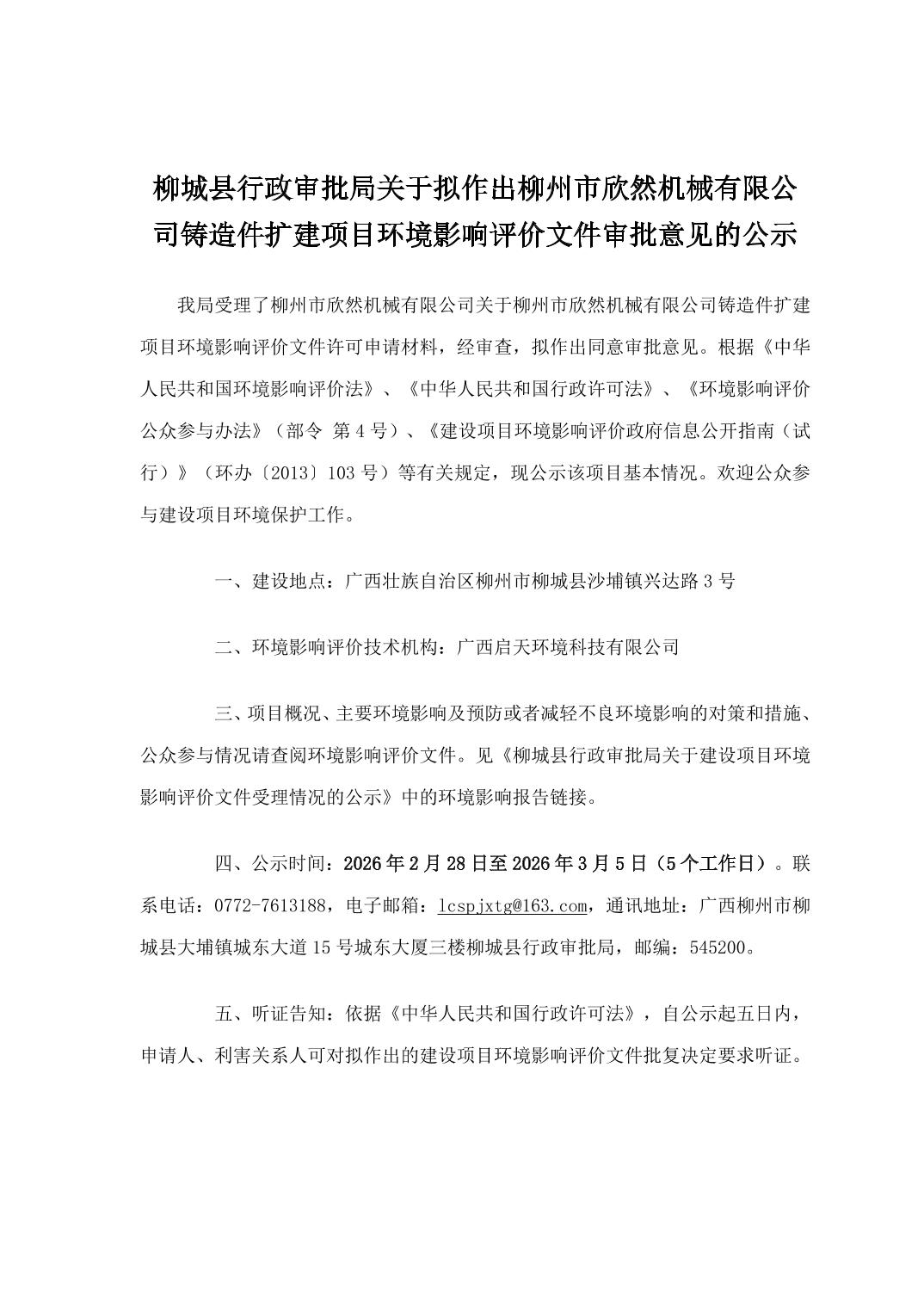 柳城縣行政審批局關(guān)于擬作出柳州市欣然機械有限公司鑄造件擴建項目環(huán)境影響評價文件審批意見的公示