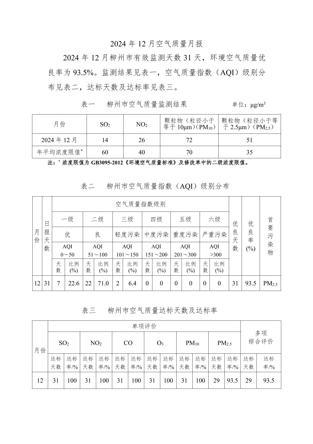 2024年12月份柳州市環(huán)境空氣質(zhì)量報告