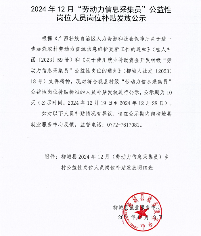 2024 年12月“勞動力信息采集員”公益性崗位人員崗位補貼發(fā)放公示