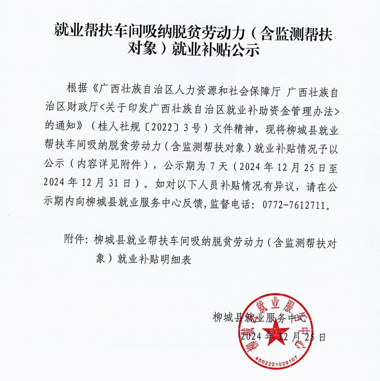 就業(yè)幫扶車間吸納脫貧勞動(dòng)力(含監(jiān)測幫扶對(duì)象)就業(yè)補(bǔ)貼公示