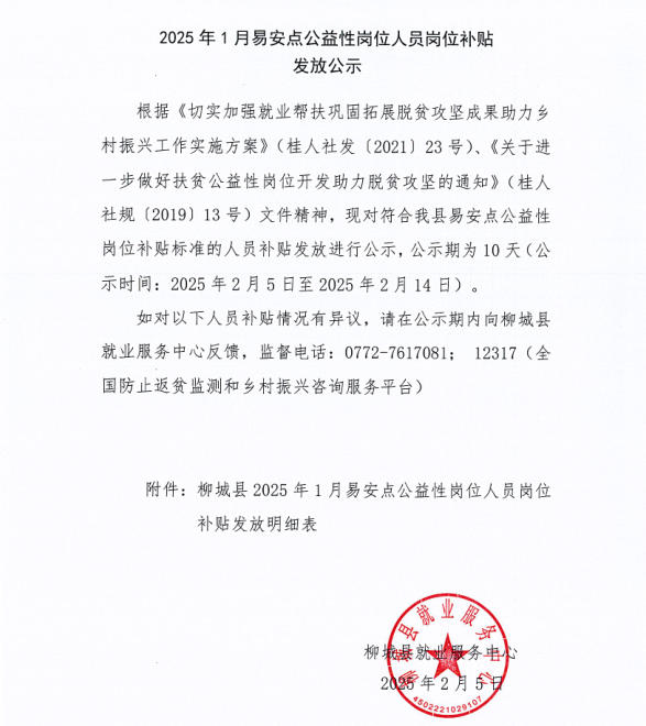2025年1月易安點公益性崗位人員崗位補貼發(fā)放公示