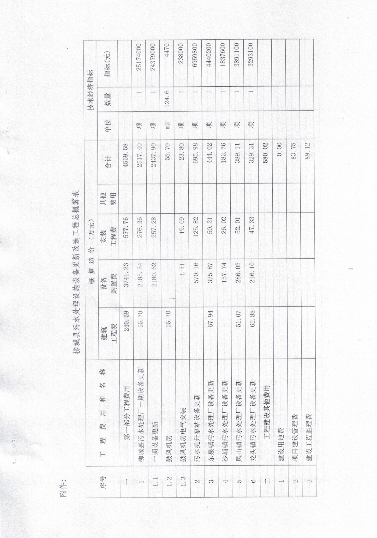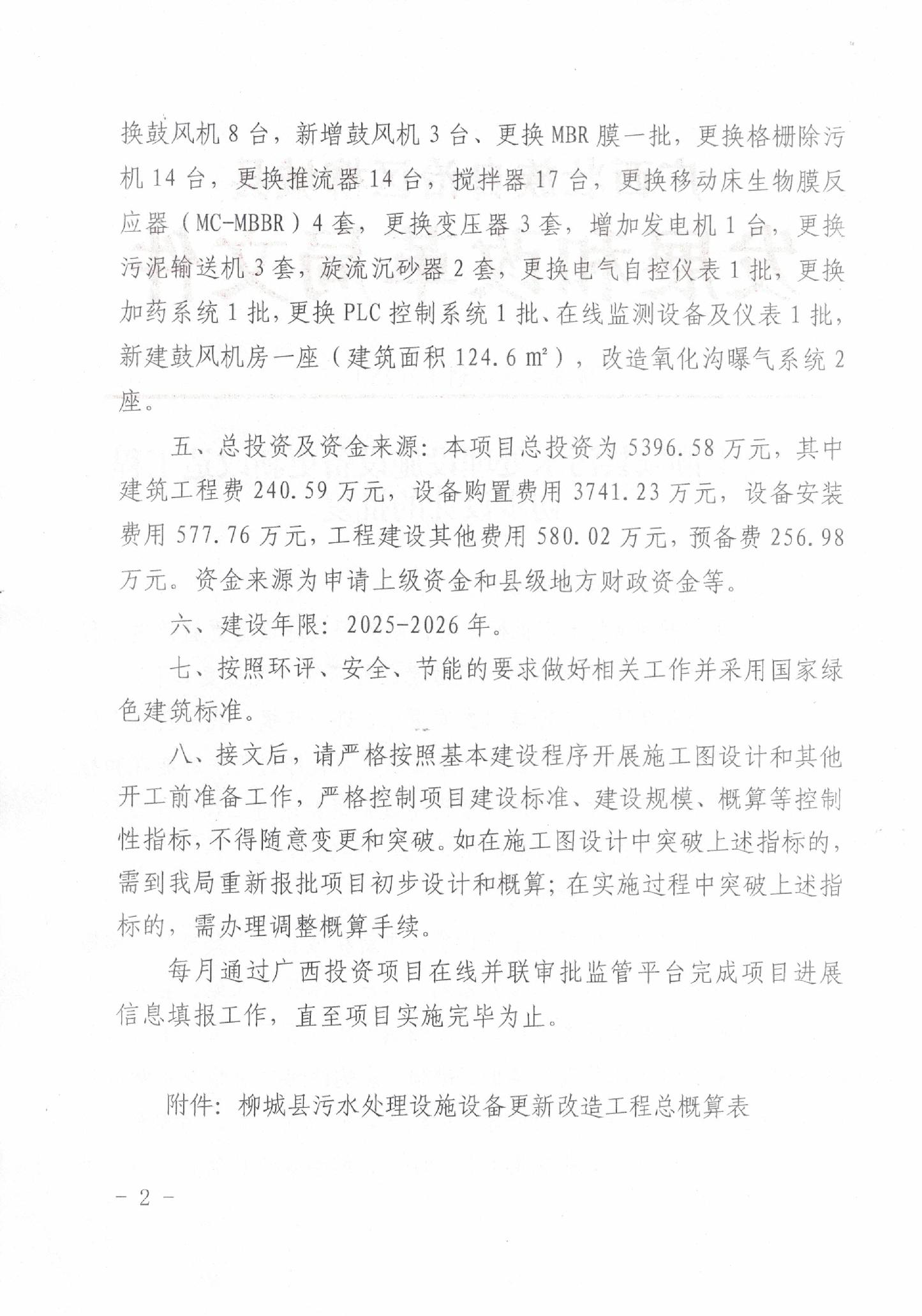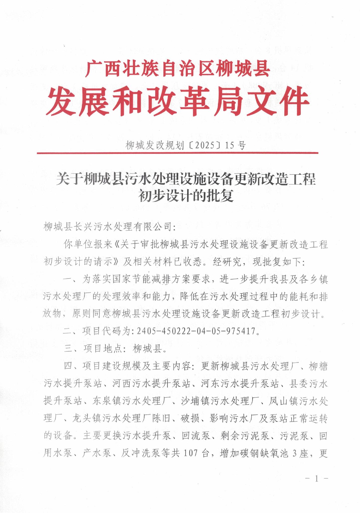 關于柳城縣污水處理設施設備更新改造工程初步設計的批復
