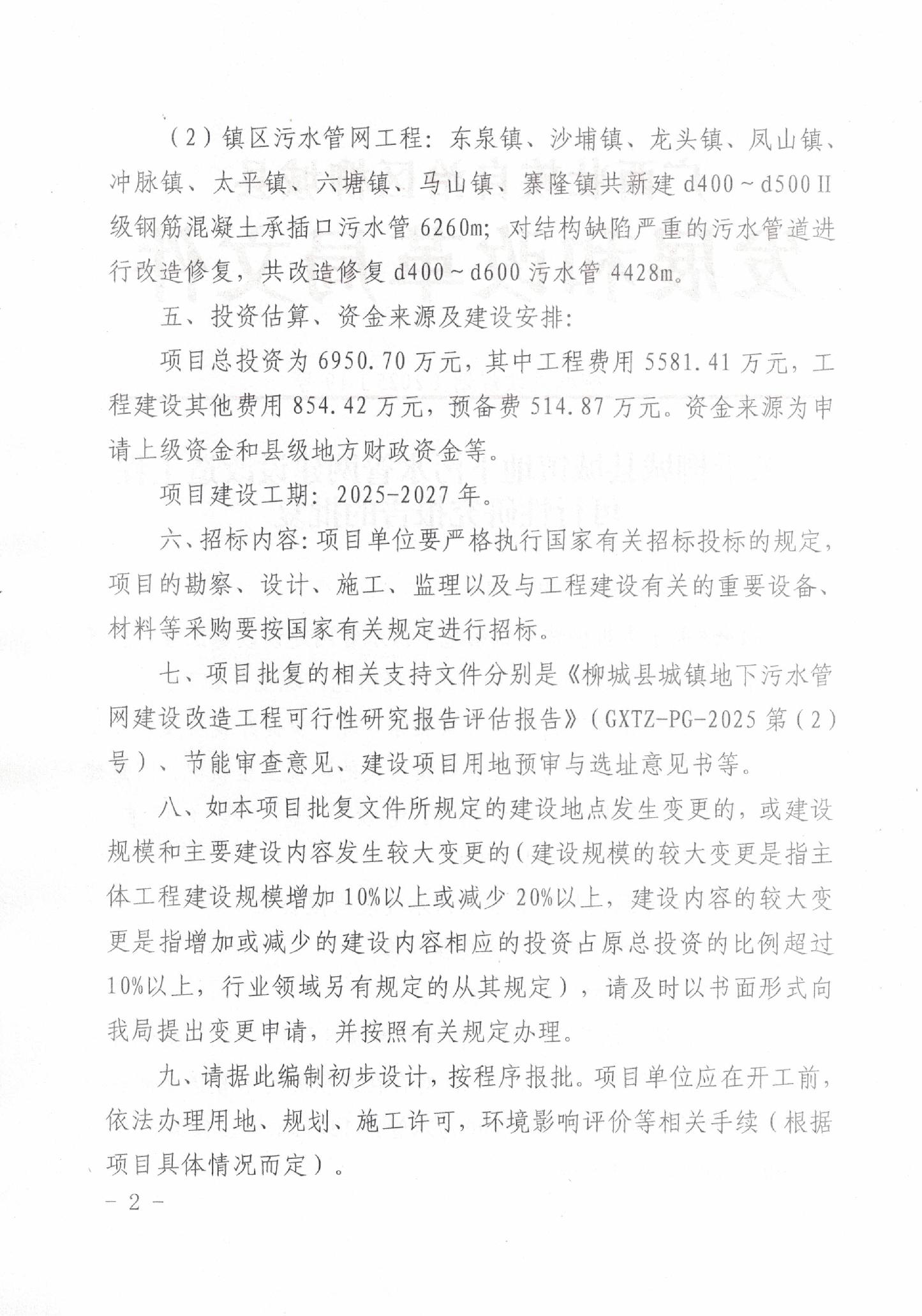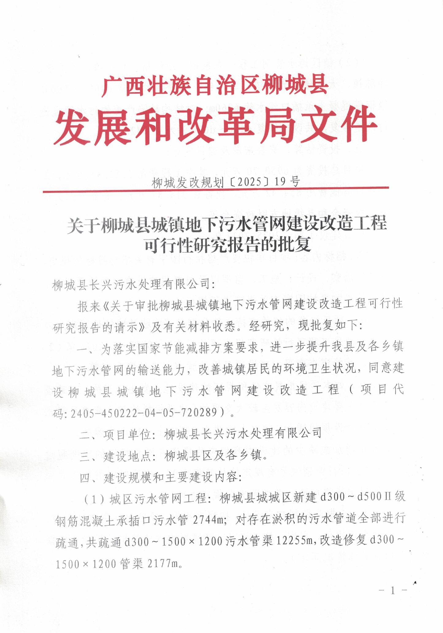 關(guān)于柳城縣城鎮(zhèn)地下污水管網(wǎng)建設(shè)改造工程可行性研究報(bào)告的批復(fù)