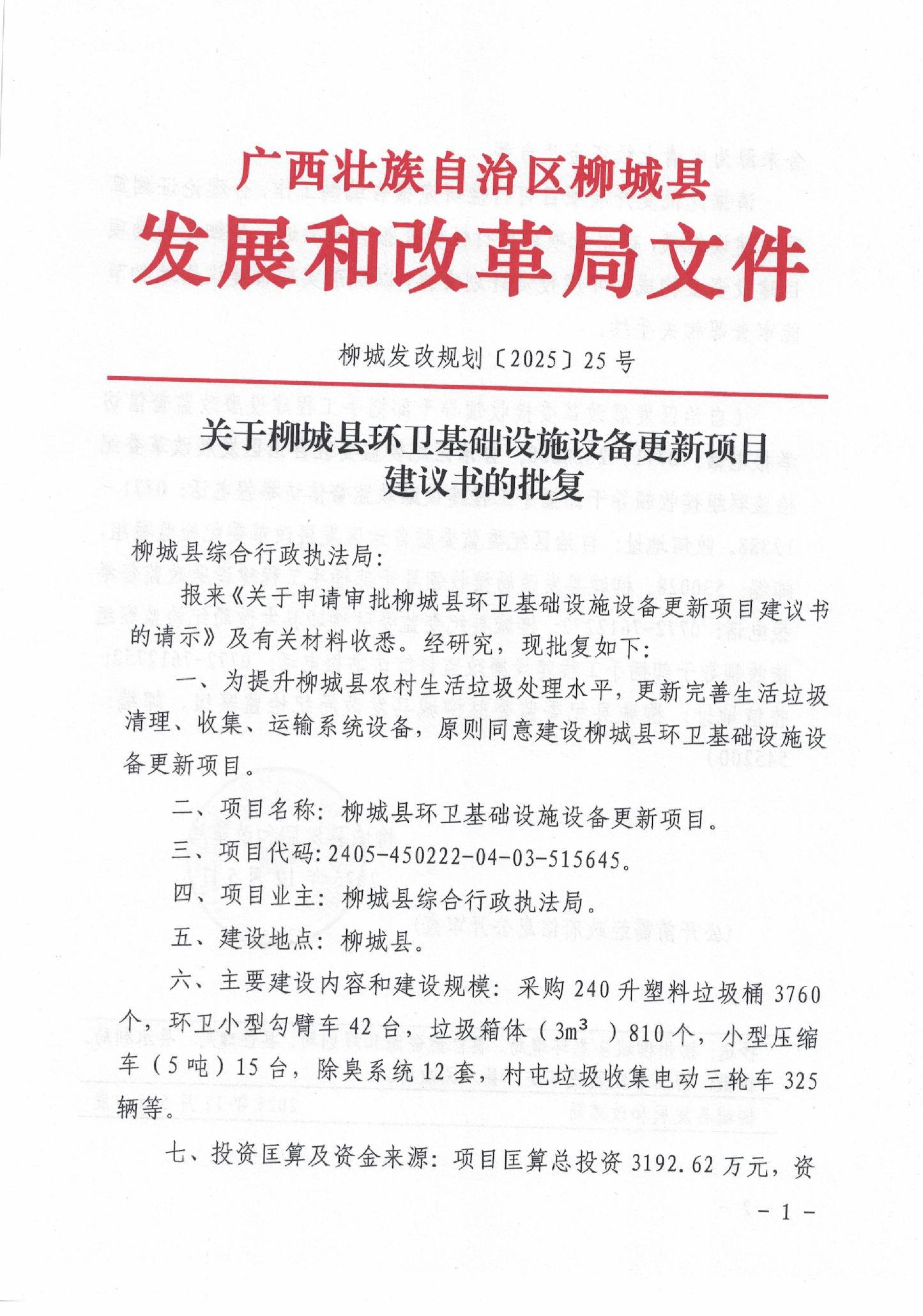 關于柳城縣環(huán)衛(wèi)基礎設施設備更新項目建議書的批復