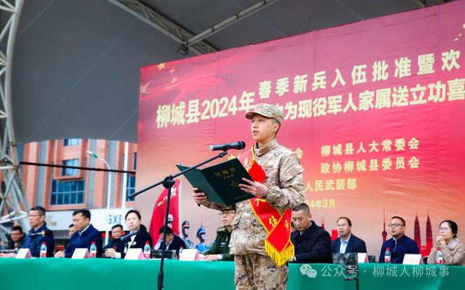 縣人武部部長(zhǎng)武曉雷宣讀2024年春季征兵入伍命令。柳城縣領(lǐng)導(dǎo)和相關(guān)負(fù)責(zé)人為新兵代表頒發(fā)入伍通知書。新兵代表曾楊 懿發(fā)言。曾楊 懿說,到部隊(duì)后,他將以服從命令為天職,努力學(xué)習(xí),刻苦訓(xùn)練;尊敬領(lǐng)導(dǎo)、團(tuán)結(jié)戰(zhàn)友;勇當(dāng)重任,為國(guó)家的和平與安寧扛好槍,站好崗;爭(zhēng)當(dāng)優(yōu)秀士兵,爭(zhēng)當(dāng)英雄模范,為父老鄉(xiāng)親增光添彩。
